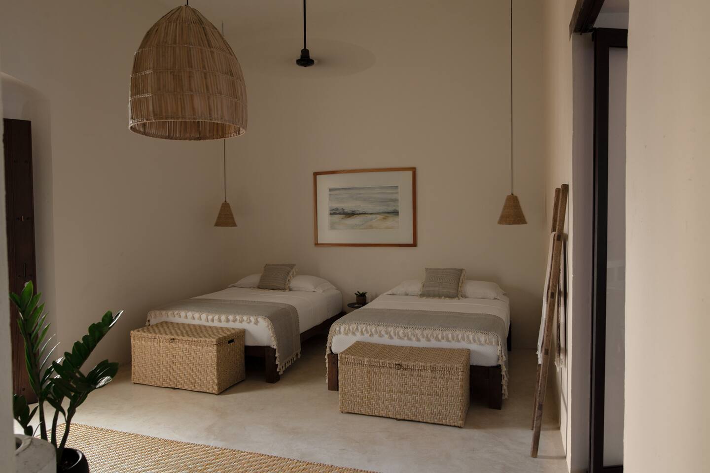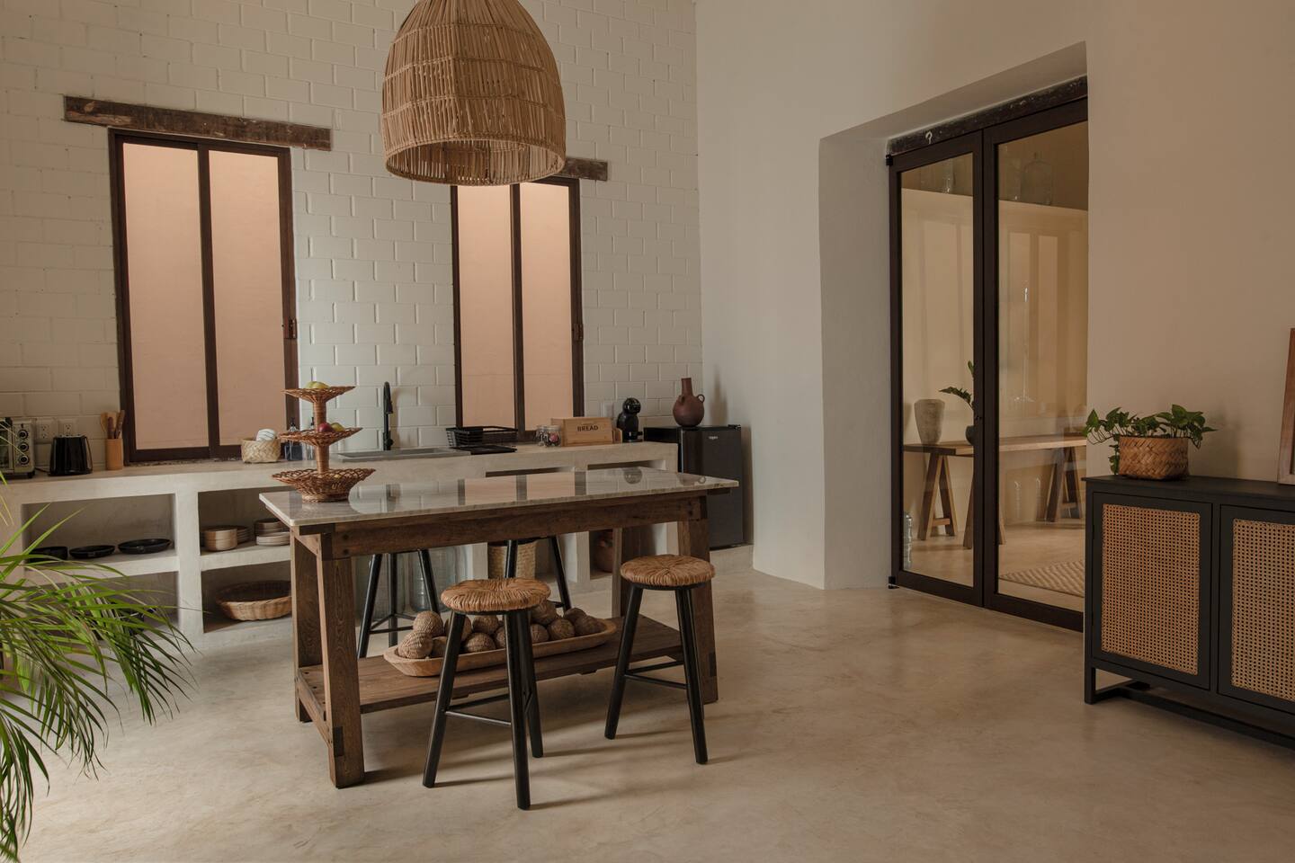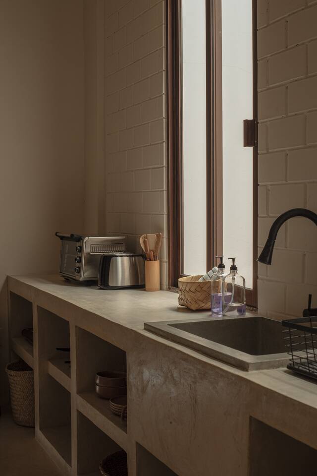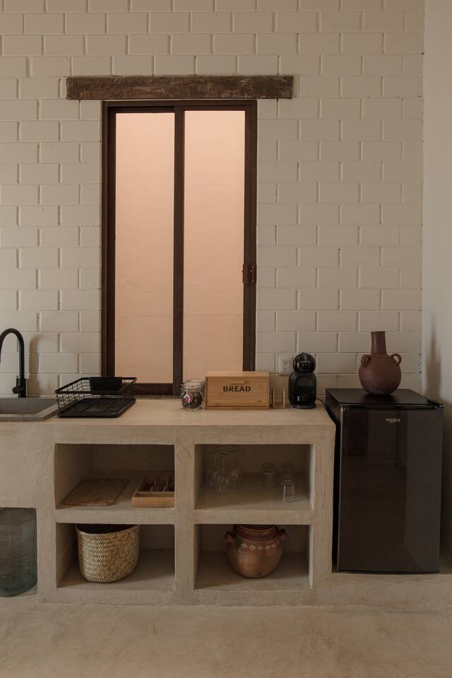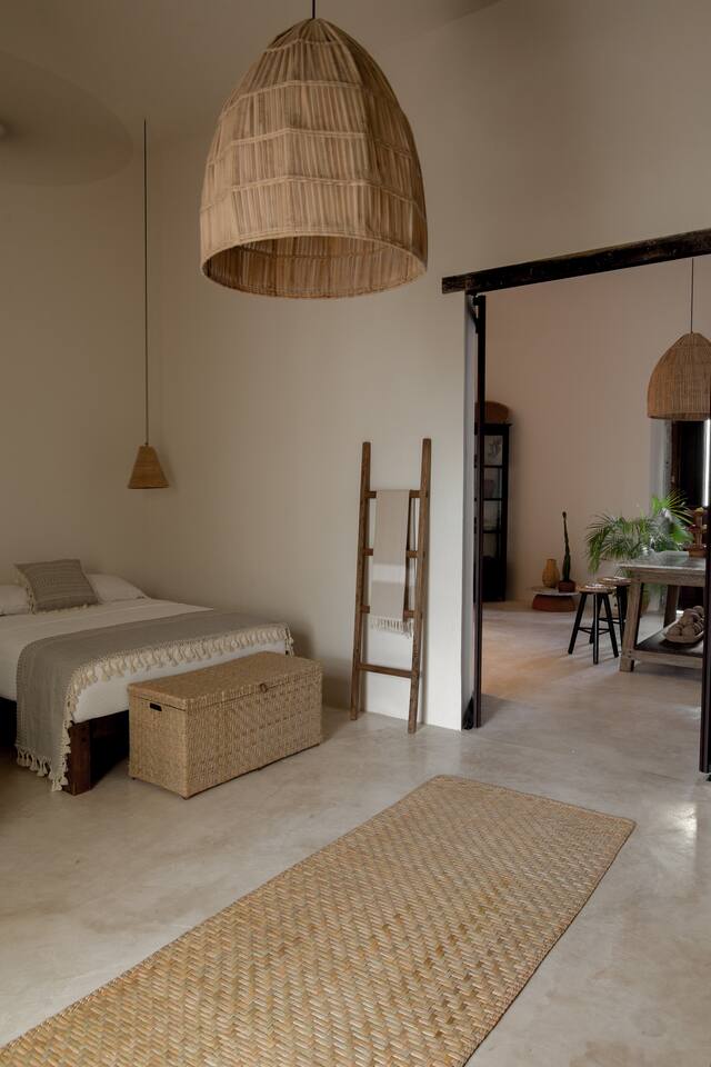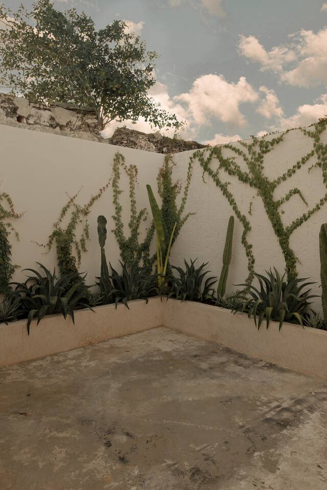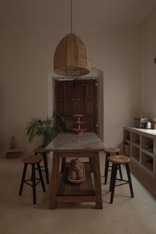 Casa Solario was designed to enjoy the experience of living in the heart of the city. It is a spacious and welcoming space, with floors and walls covered with chukum (resin extracted from a tree in the region), handcrafted decorative details made of liana and palm, pink-purple wood furniture (Maculis) and a terrace full of agaves and vines for a stay full of calm. Walking you can enjoy colorful afternoons, the evening breeze and magnificent sunsets.